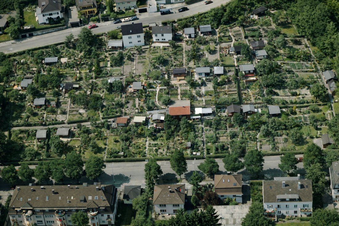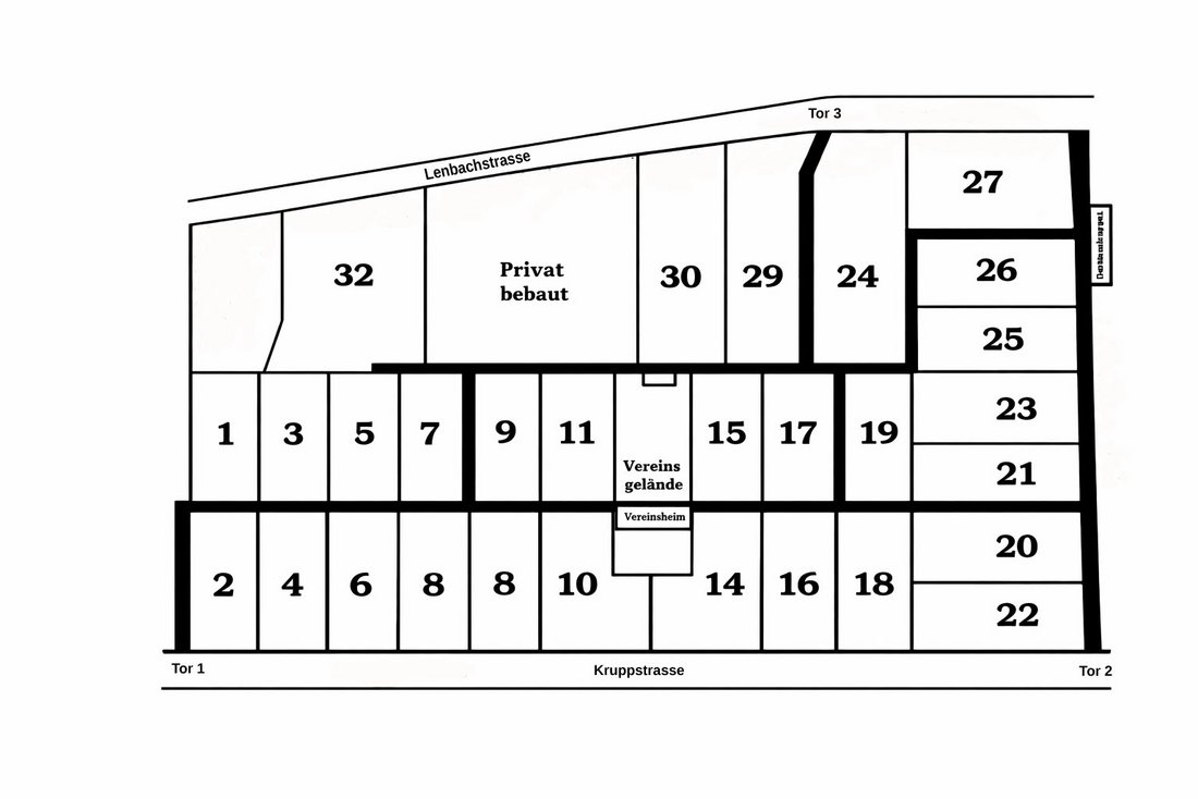 Hier eine Ansicht unserer Anlage, die unten von der Kruppstrasse und oben von der Lenbachstrasse begrenzt wird. Mittendrin liegt unser Vereinshaus.